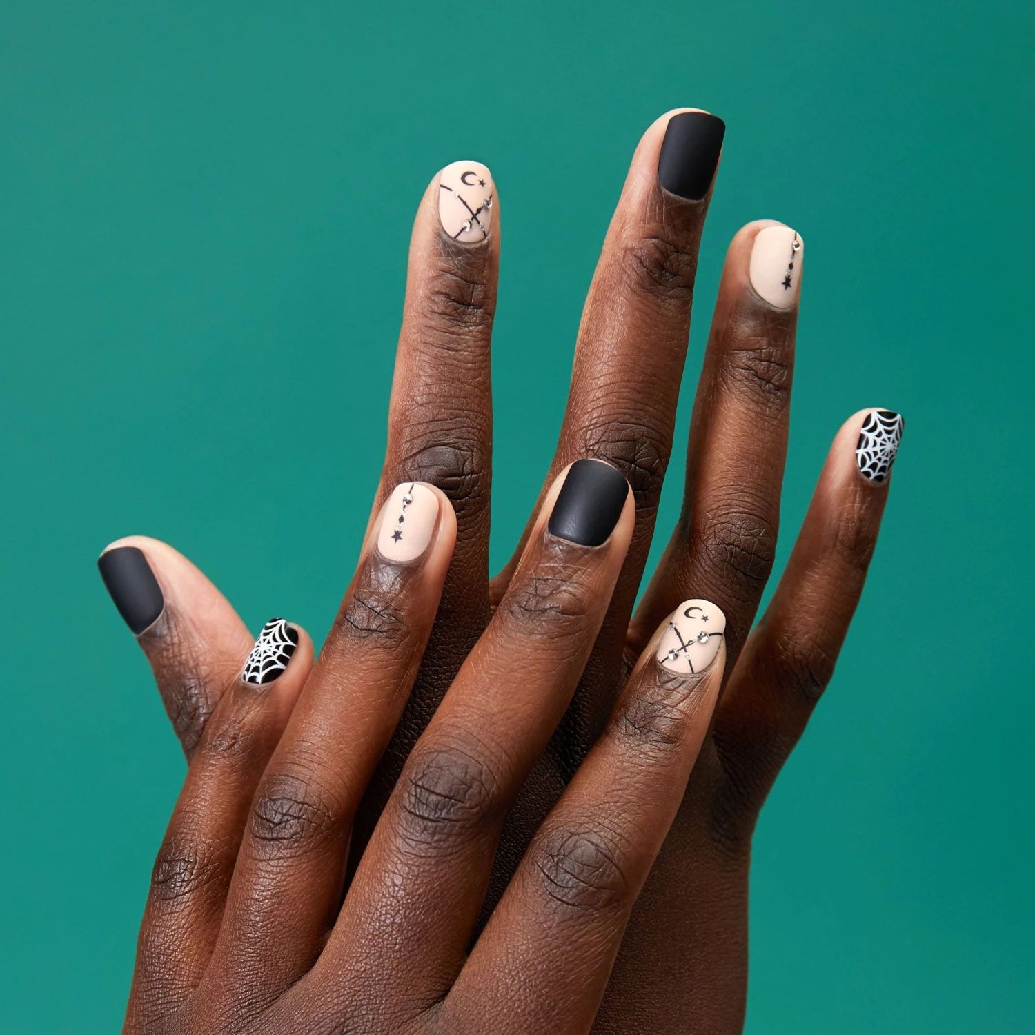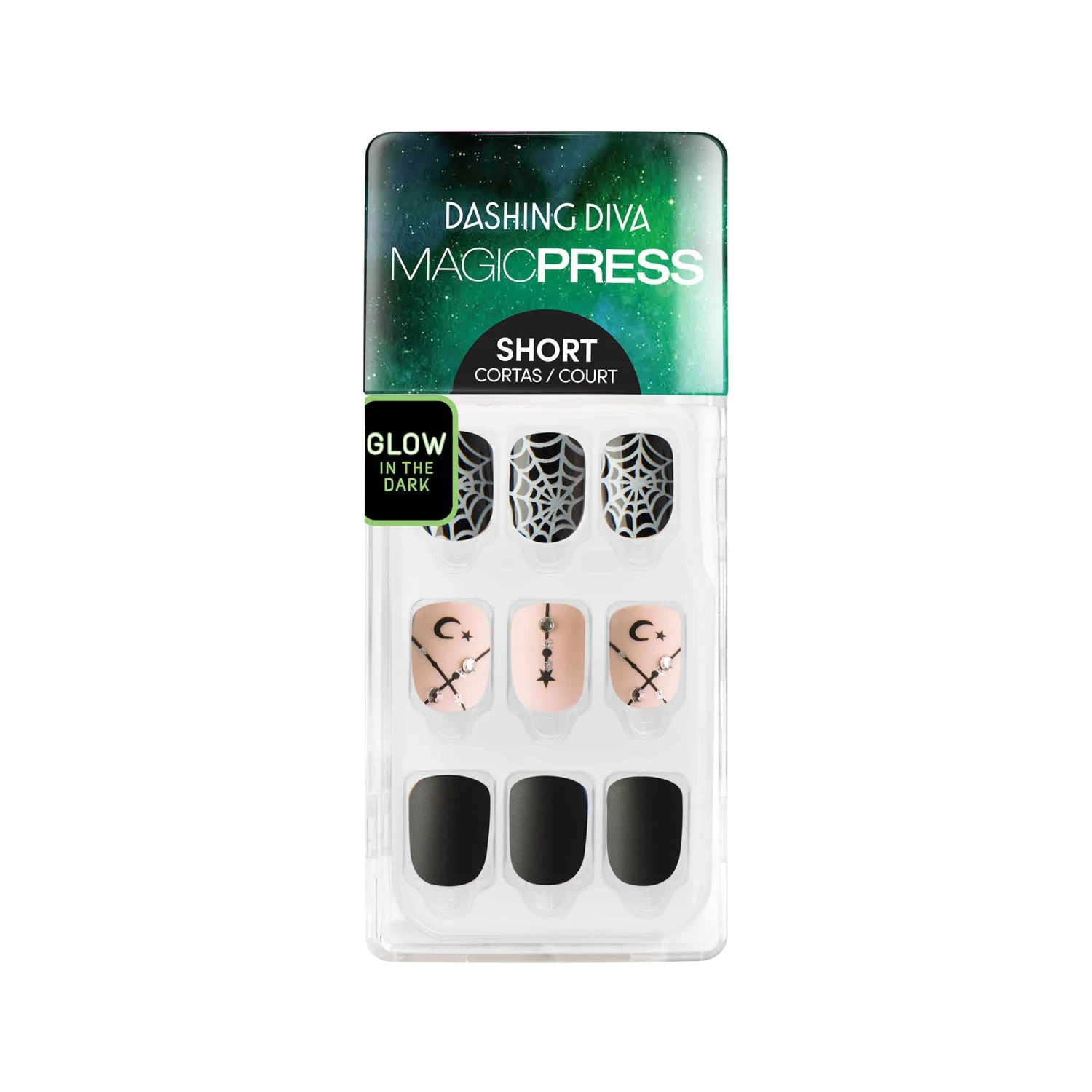 The origin of our beauty ritual dates back to many moons ago.. Short length, square shape, glossy & matte black press-on gel nails featuring silver spiderwebs, rhinestones, and line art accents. Glow in the dark details.
