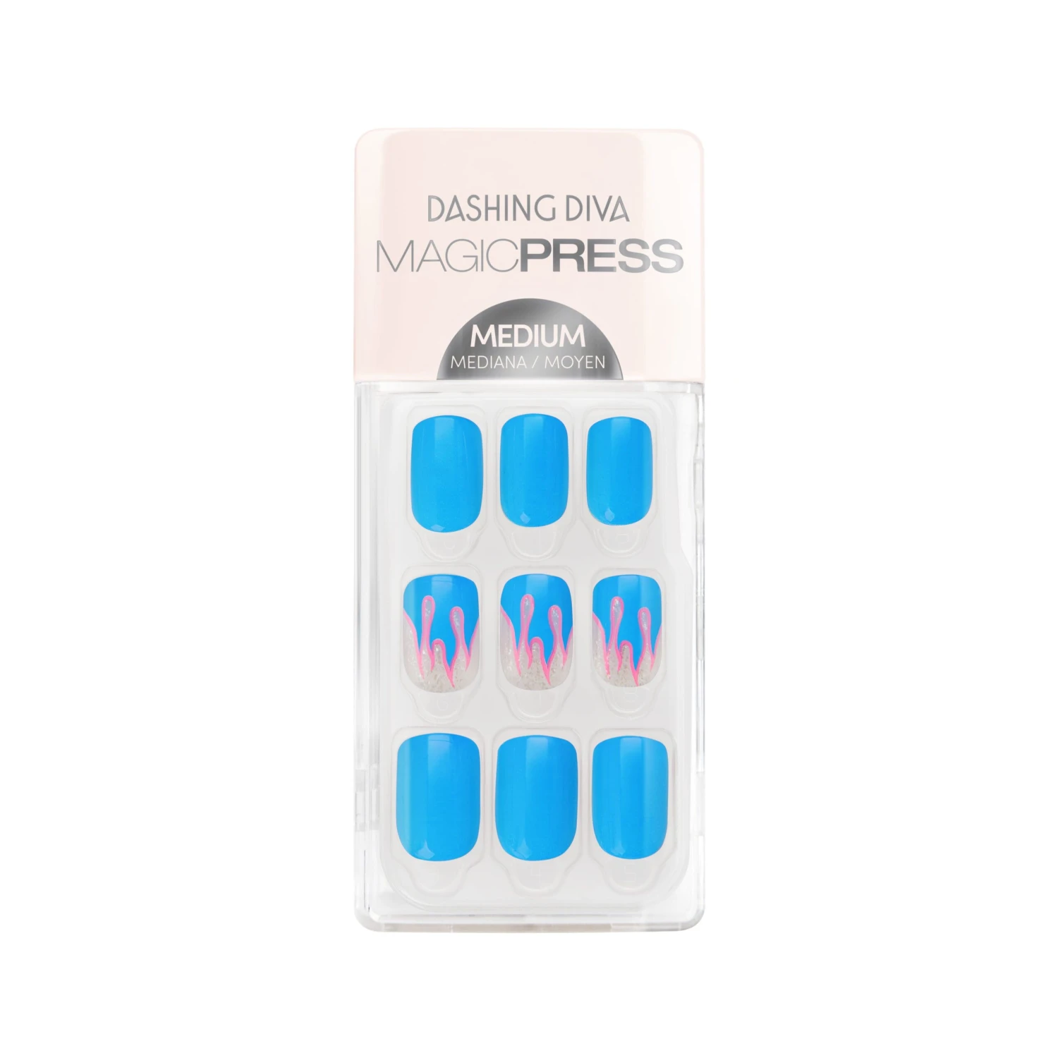 Sport the hottest manicure we’ve got if you’re looking to feel Bad and Blue-gie. Medium length, square shape, glossy finish electric blue press-on gel nails featuring flame accents with pink details.