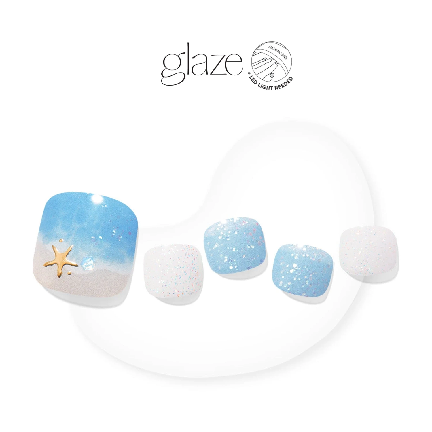 Semi-cured blue & white gel pedicure strips featuring iridescent glitter, 3D gold starfish, and detailed ocean artwork with mega volume & maximum shine.