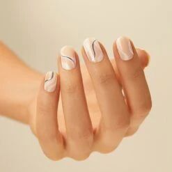 Medium length, almond shape, glossy finish. Semi-sheer peachy nude press-on gel nails featuring glittered pink french tips.