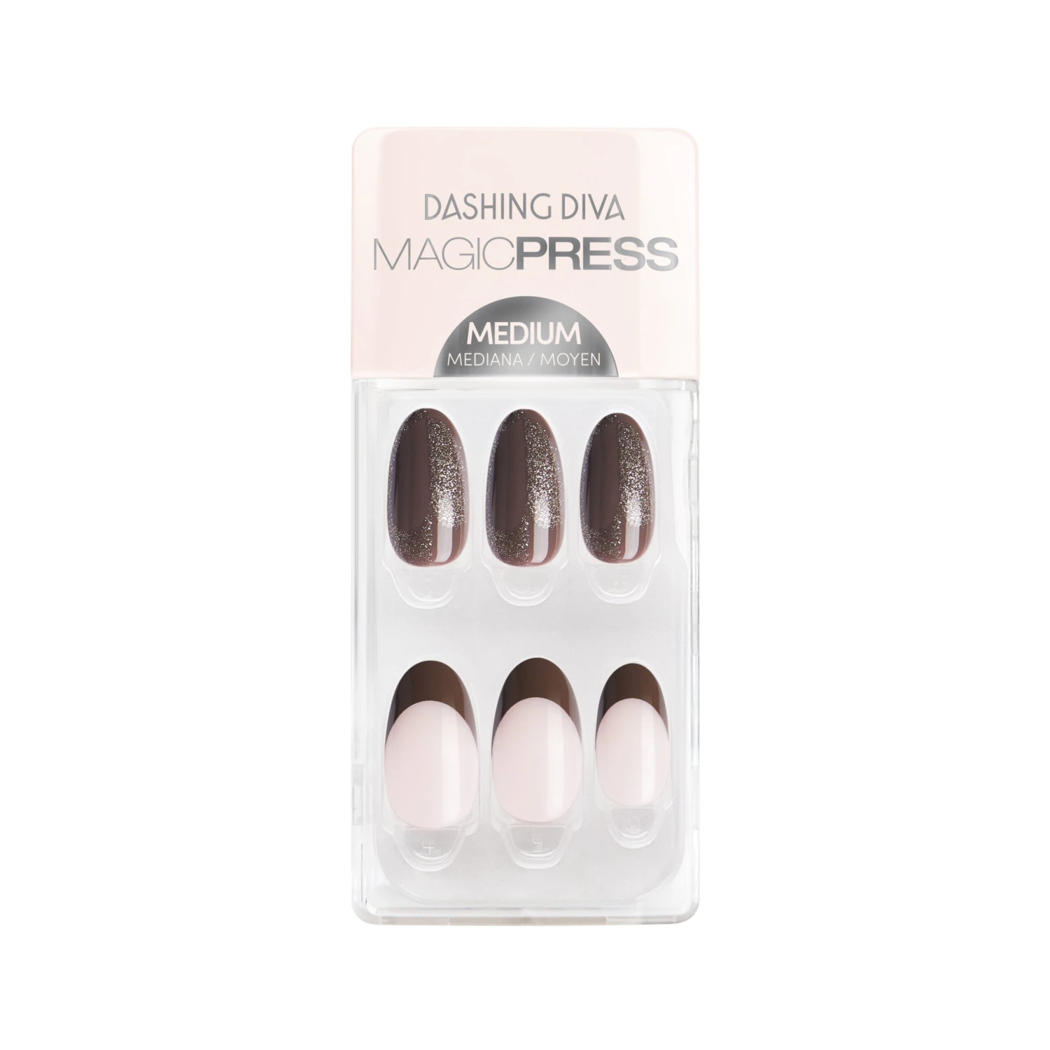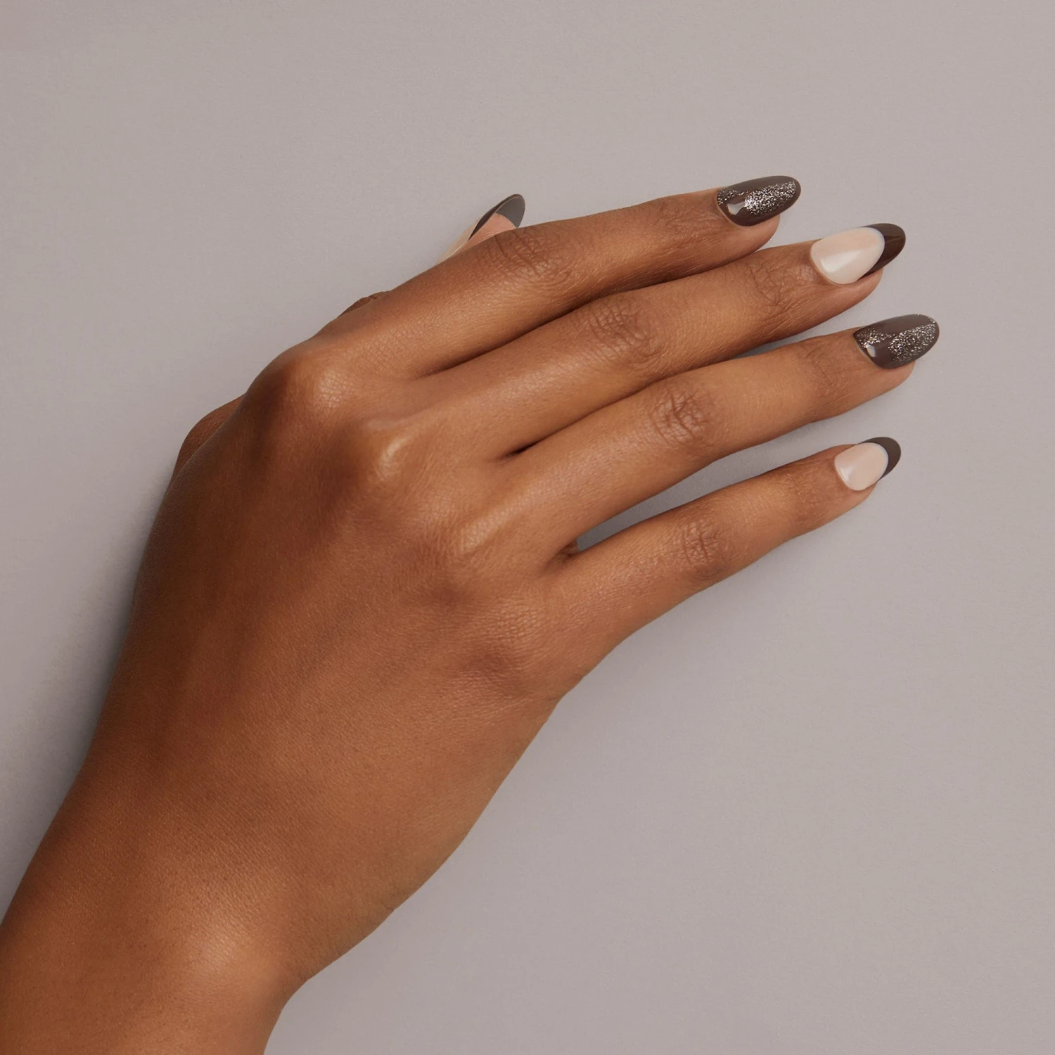 Medium length, almond shape, glossy finish. Cocoa brown & semi-sheer nude press-on gel nails featuring cocoa brown french tips and champagne glitter.