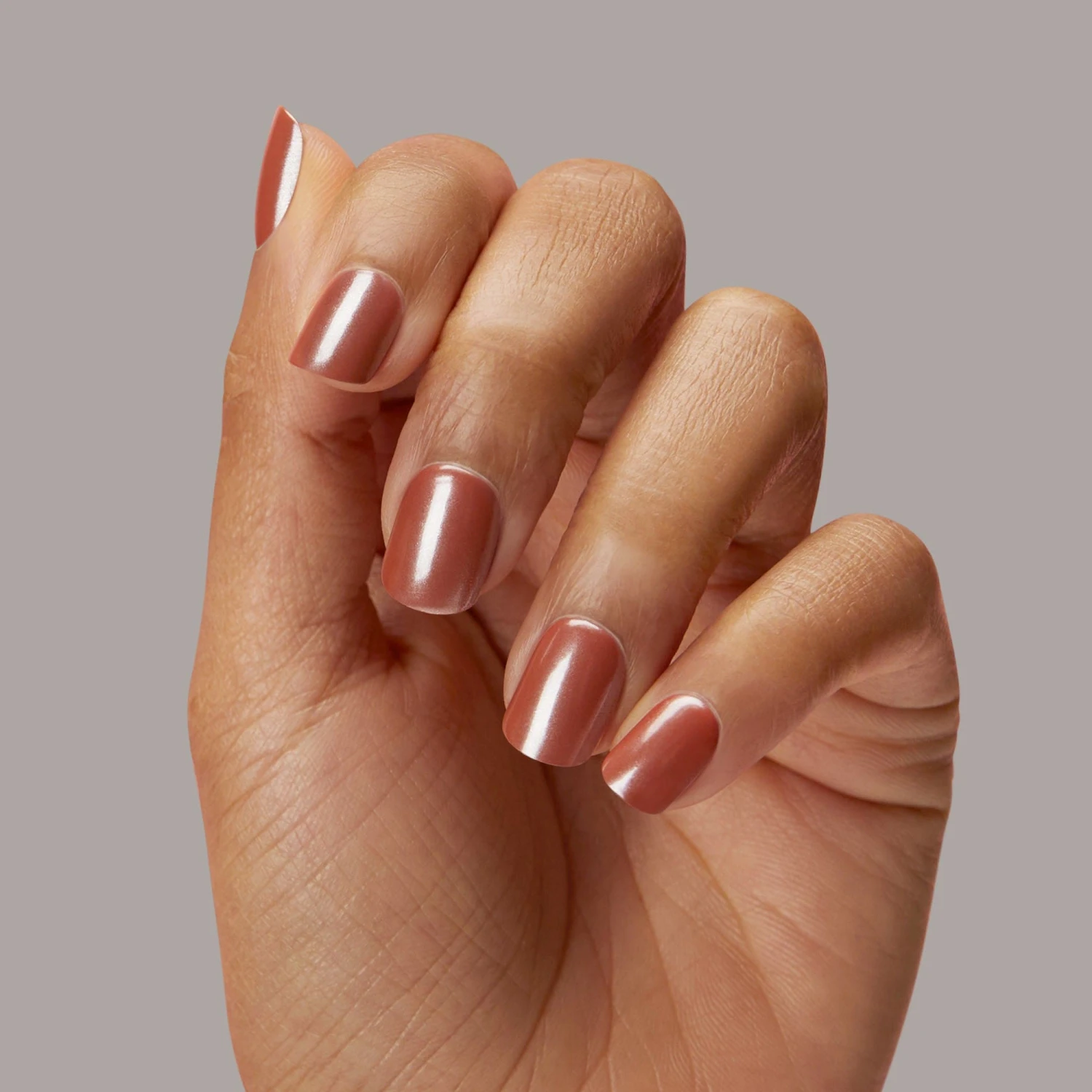 Short length, square shape, warm rust brown press-on gel nails featuring a glossy, shimmery chrome finish.