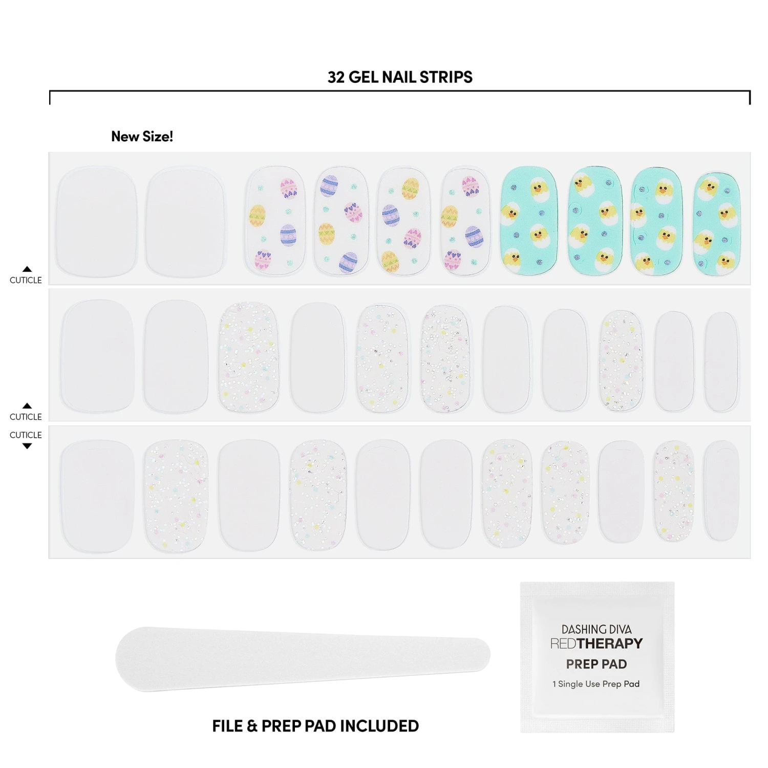 Seasonally chic! White and soft green gel nail strips featuring Easter eggs, baby chicks, and polka dots with a glossy, high-shine finish.