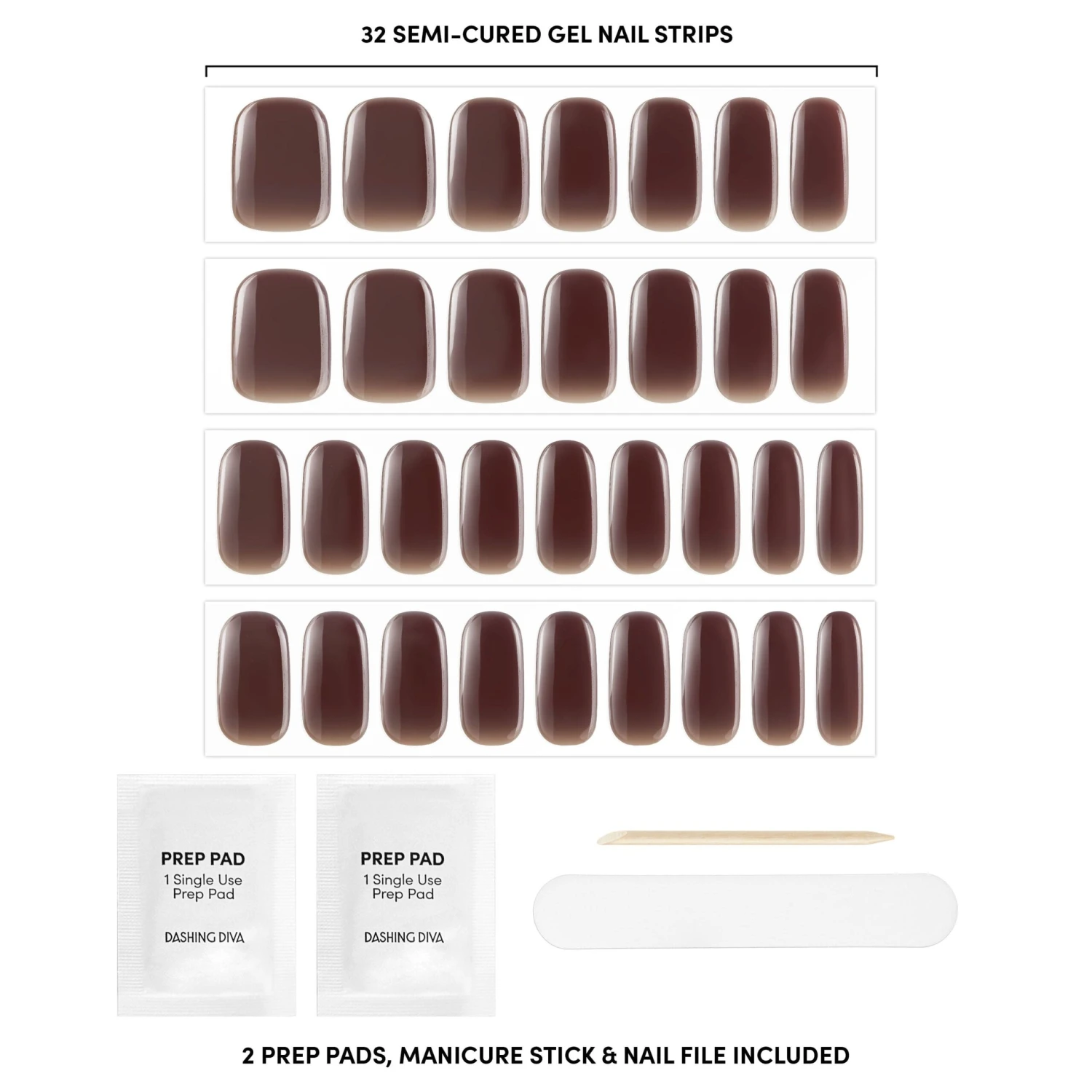 Semi-cured rich chocolate brown gel nail strips with mega volume & a sheer finish.