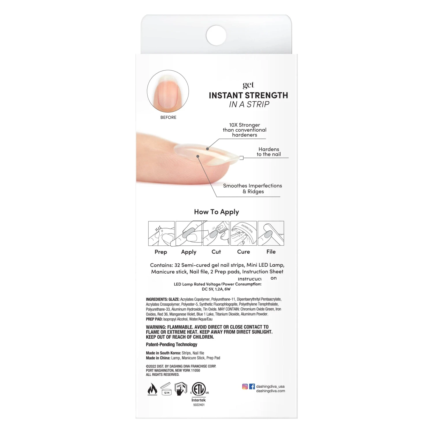 A semi-cured, clear gel nail strip topcoat that creates the appearance of a thicker, smoother nail with a healthy, high-shine finish. This all-in-one formula promotes nail growth by shielding and protecting nails for up to 14 days as a basecoat, nail strengthener, nail hardener, and topcoat. Delivers super strength, triple volume, and maximum shine with semi-cured innovation.