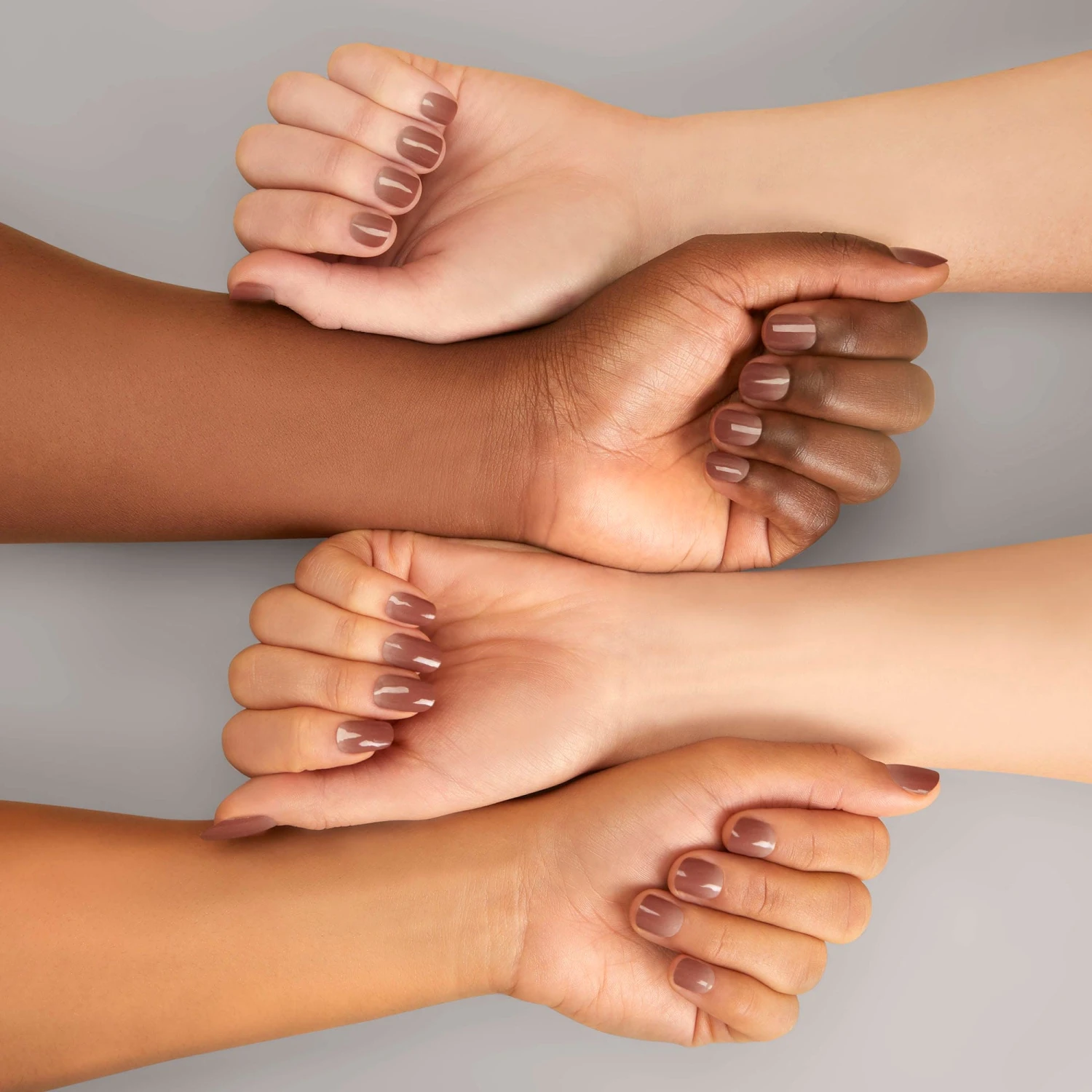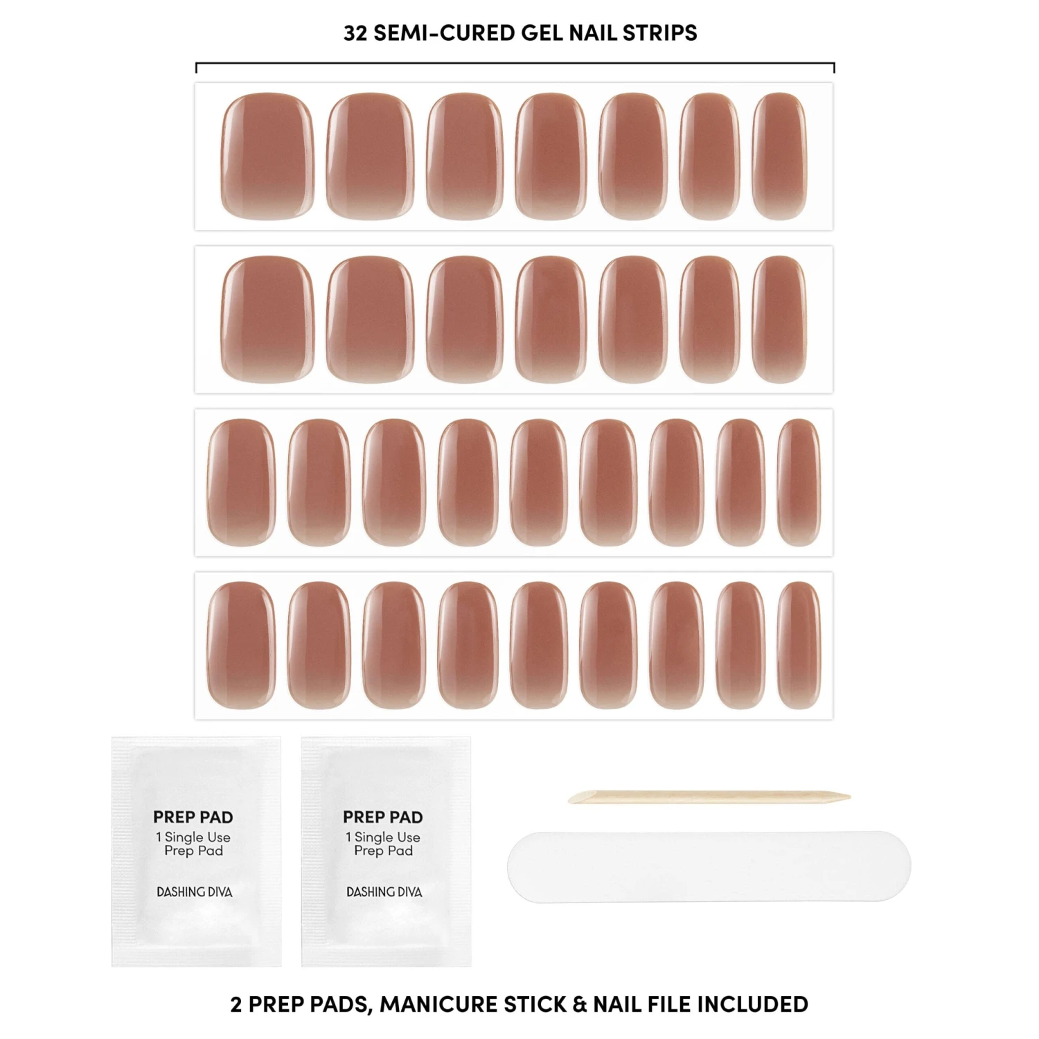 Semi-cured dusty brown gel nail strips with mega volume & a sheer finish.