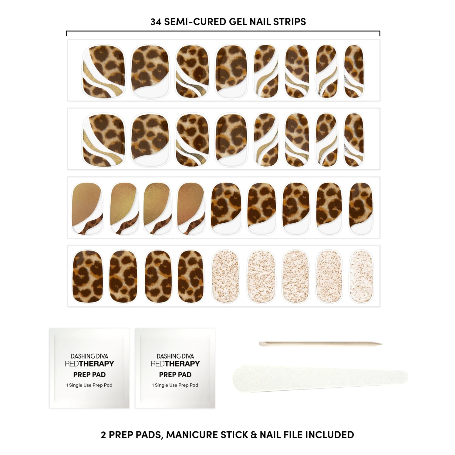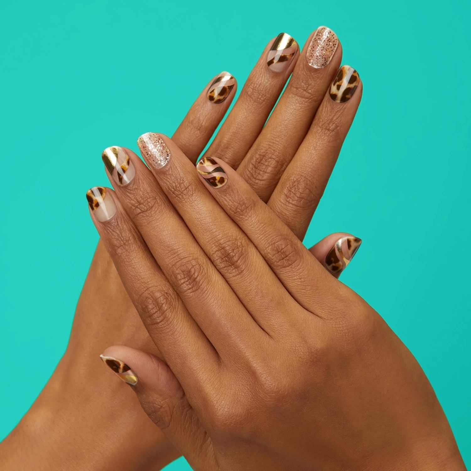 That head-kitty-in-charge feline. Semi-cured clear gel nail strips featuring abstract leopard and gold foil waves & gold and silver glitter accents with mega volume & maximum shine.