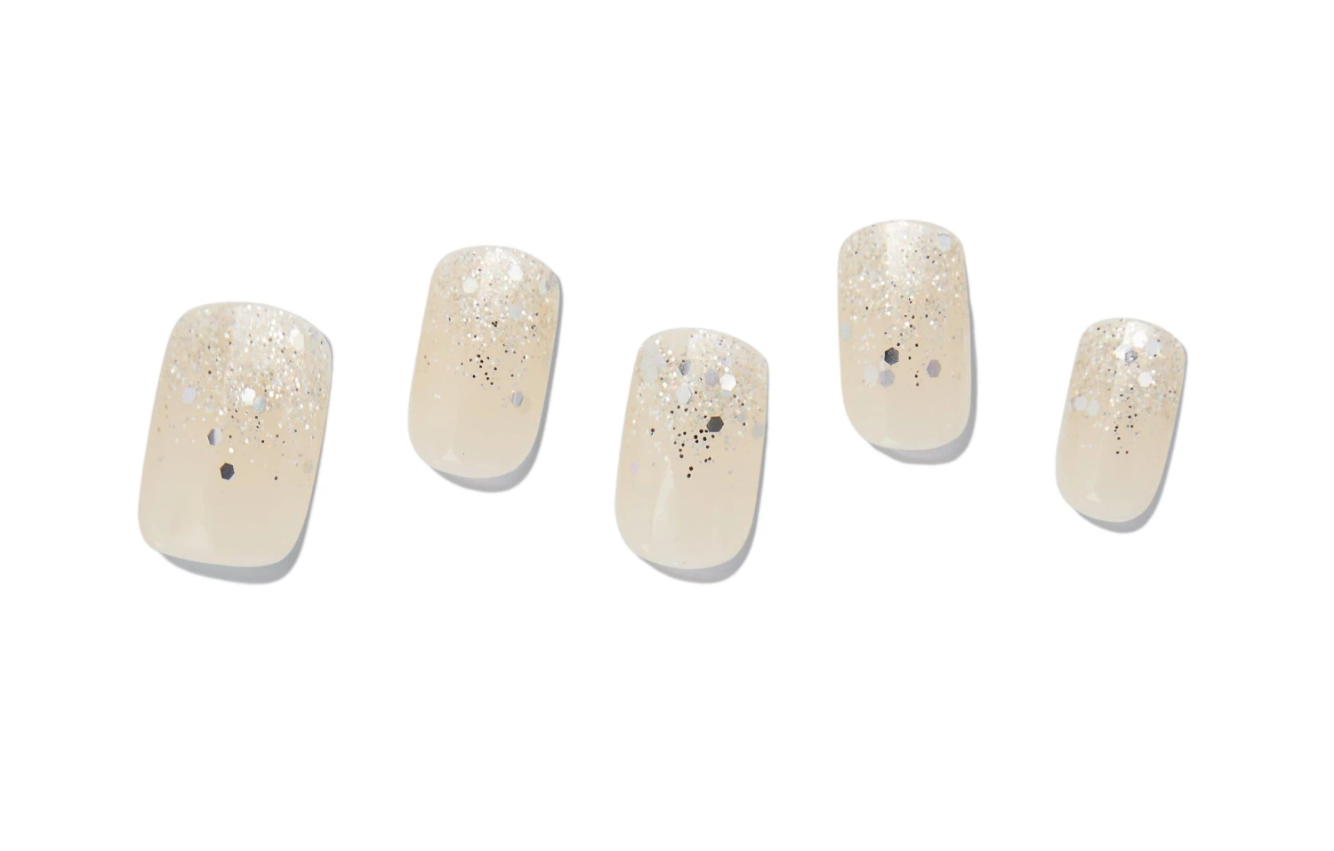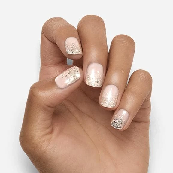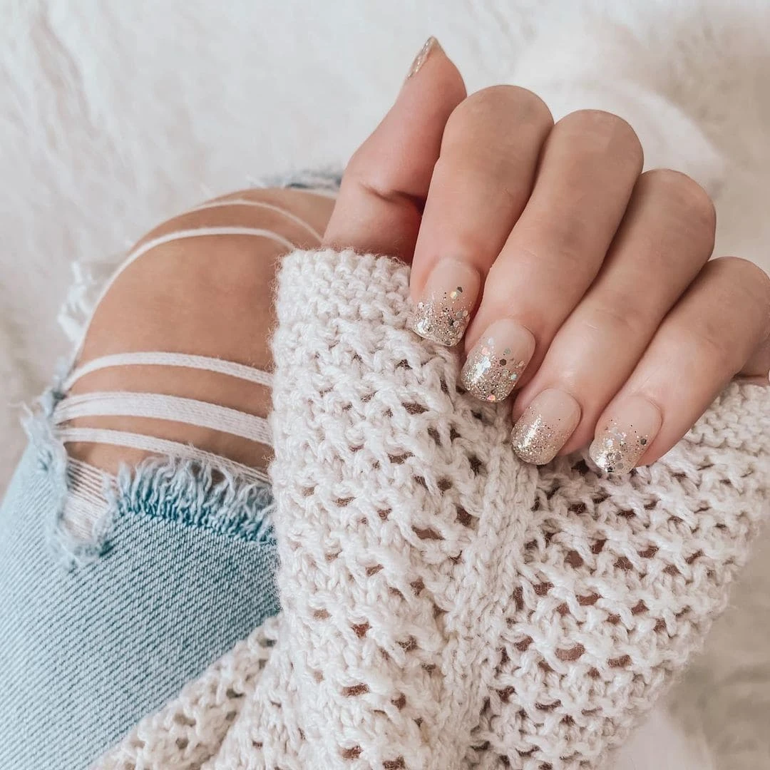Medium length, square shape, glossy finish light nude press-on gel nails featuring ombré silver glitter.
