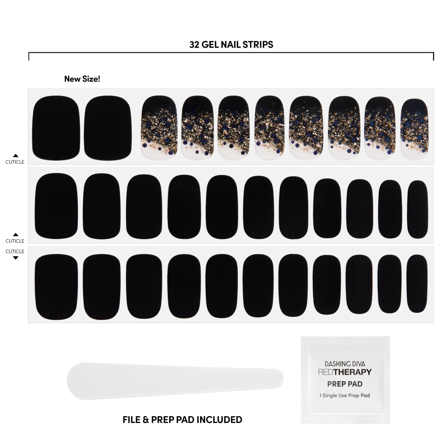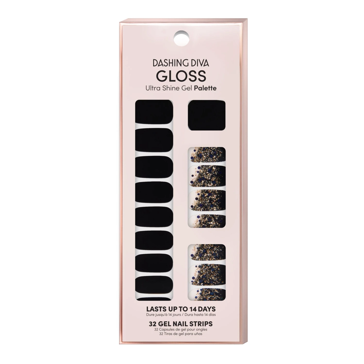 Black nail strips featuring gold foil, gradient french tips with a glossy, high-shine finish.