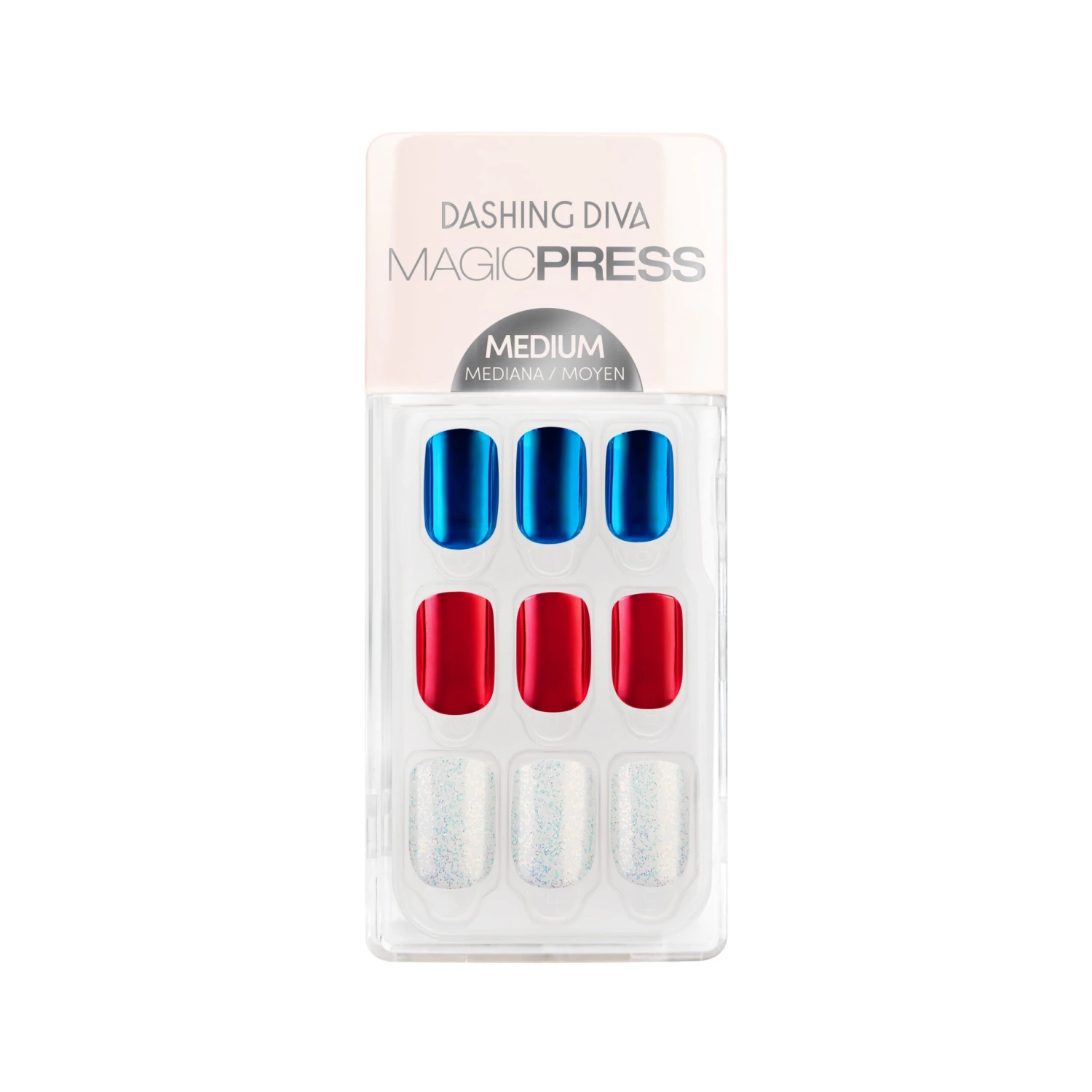 Medium length, square shape, glossy finish press-on gel nails. A metallic red, white, & blue manicure will take you to the land of the free and the Home Sweet Home of the glam!