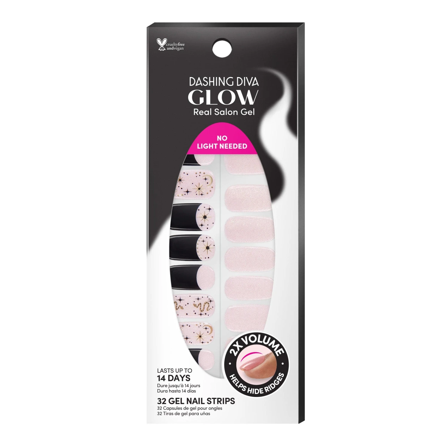 Iridescent pink/gold gel nail strips featuring a shimmery velvet effect, gold foil details, and black french tips with a double gel formula for an ultra-smooth finish.