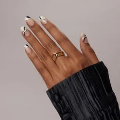 Dark green and nude nail strips featuring light green & white abstract color blocking and white daisy icons with a glossy, high-shine finish.
