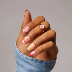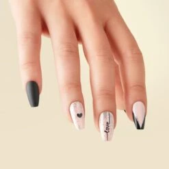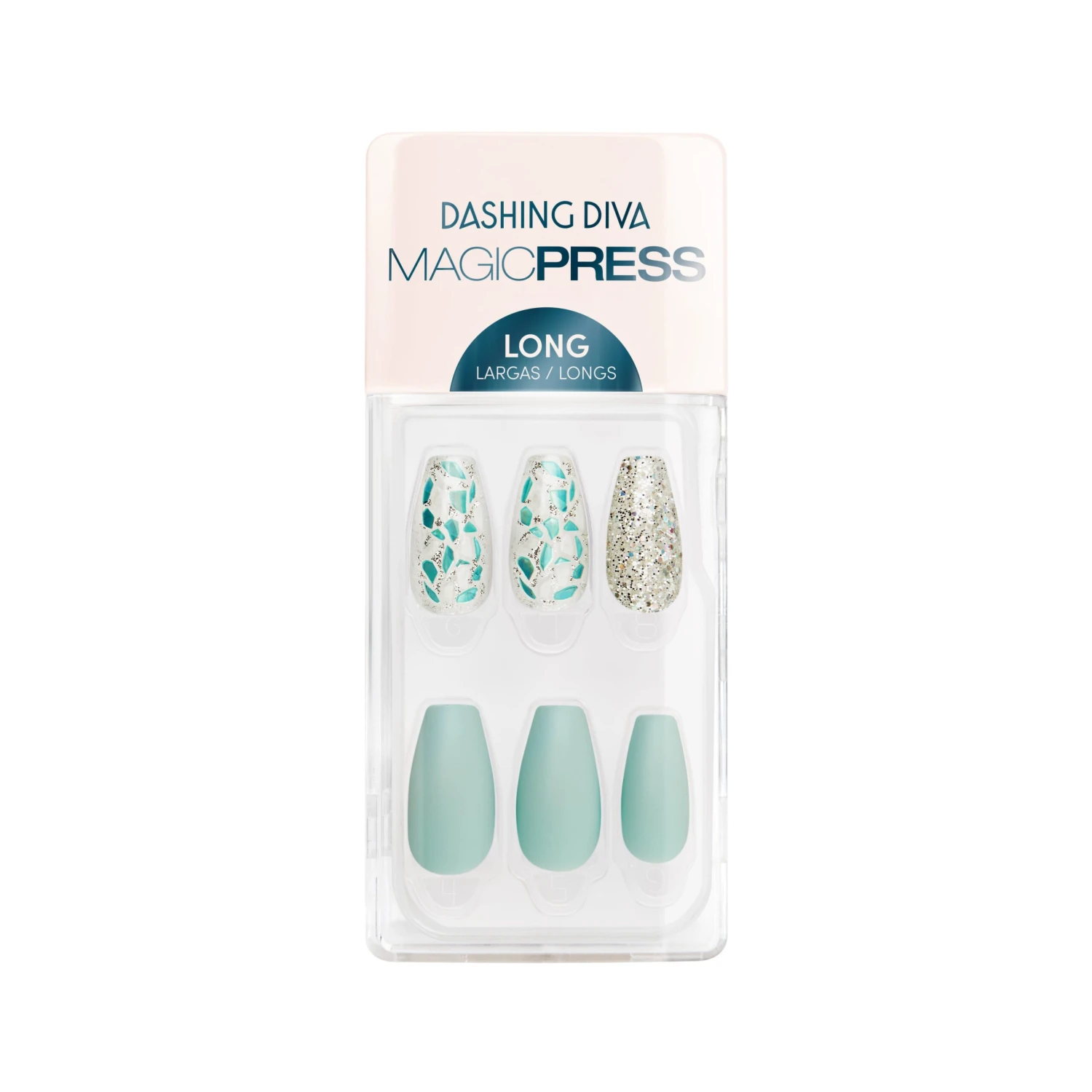 Long length, coffin shape, glossy & matte finish press-on gel nails. A mint green manicure features glitter and mosaic Meteorite accents.