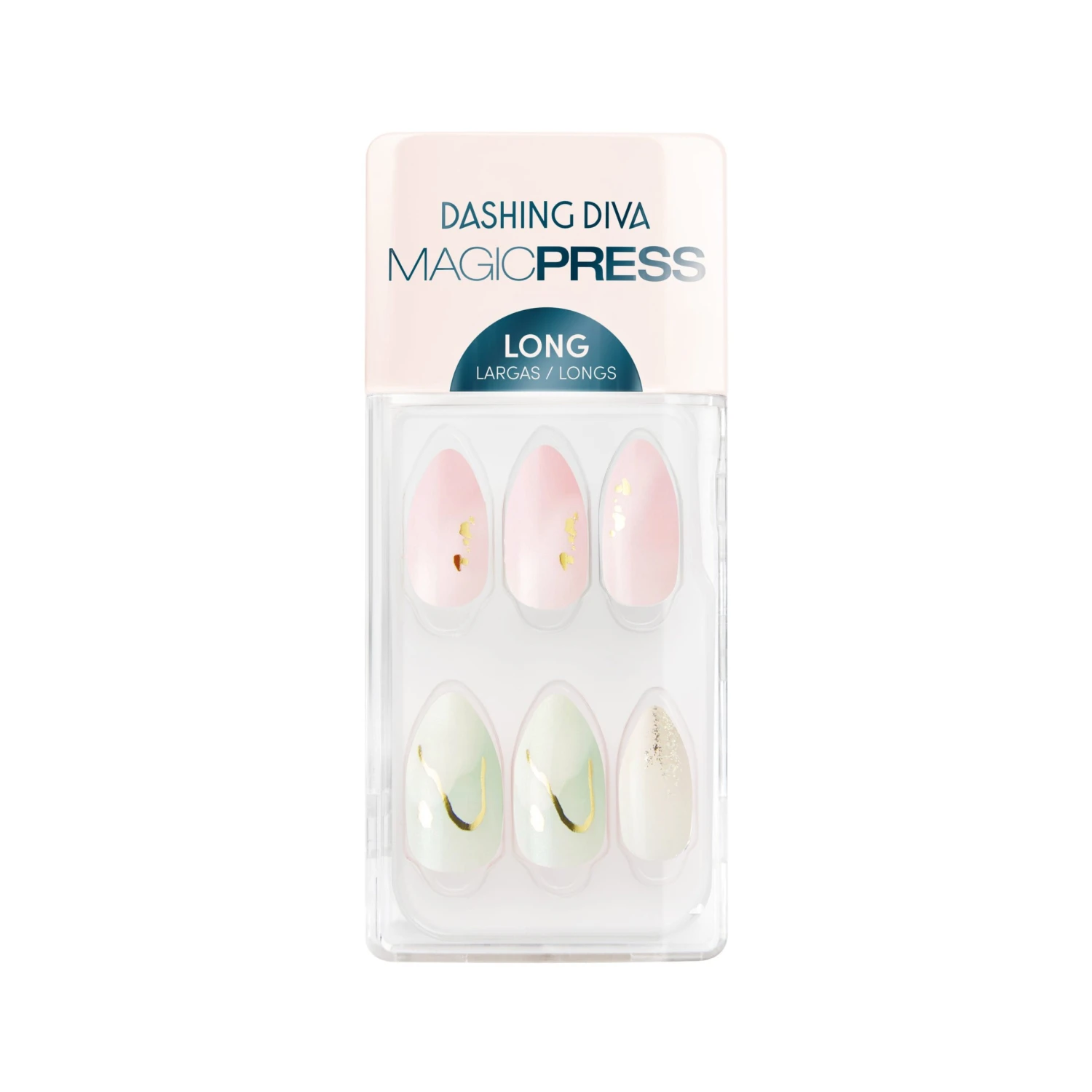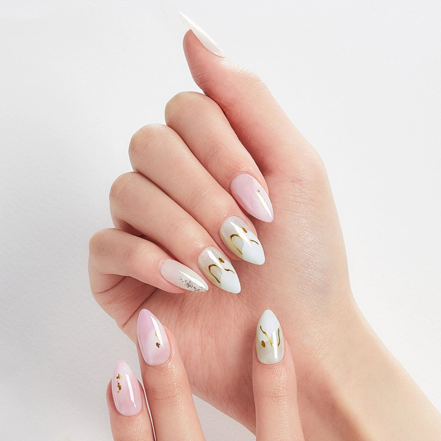 Long length, stiletto shape, glossy finish pink & mint press-on gel nails featuring gold foil and gold glitter.