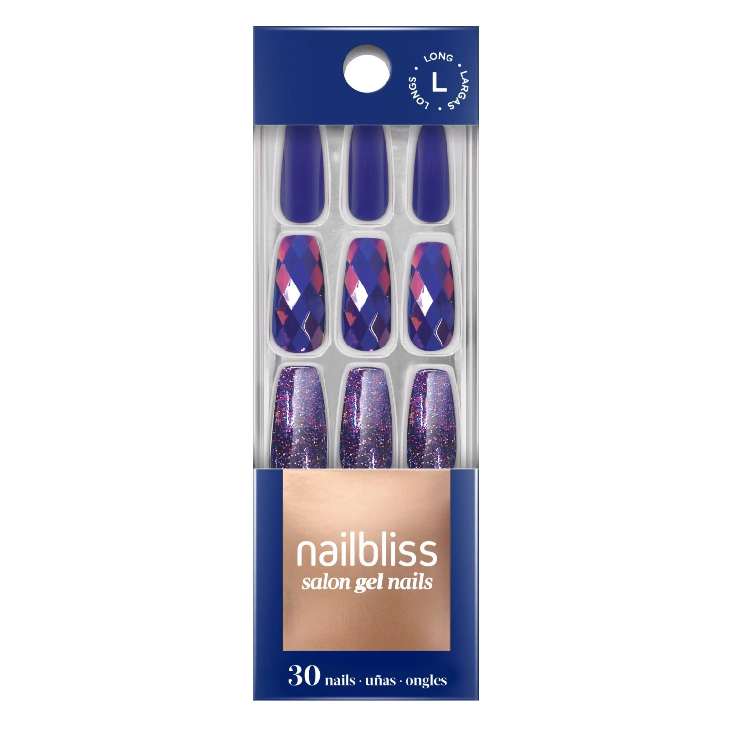 Make a statement with this set that features a solid, glossy base with a purple-blue faceted design and chunky glitter.