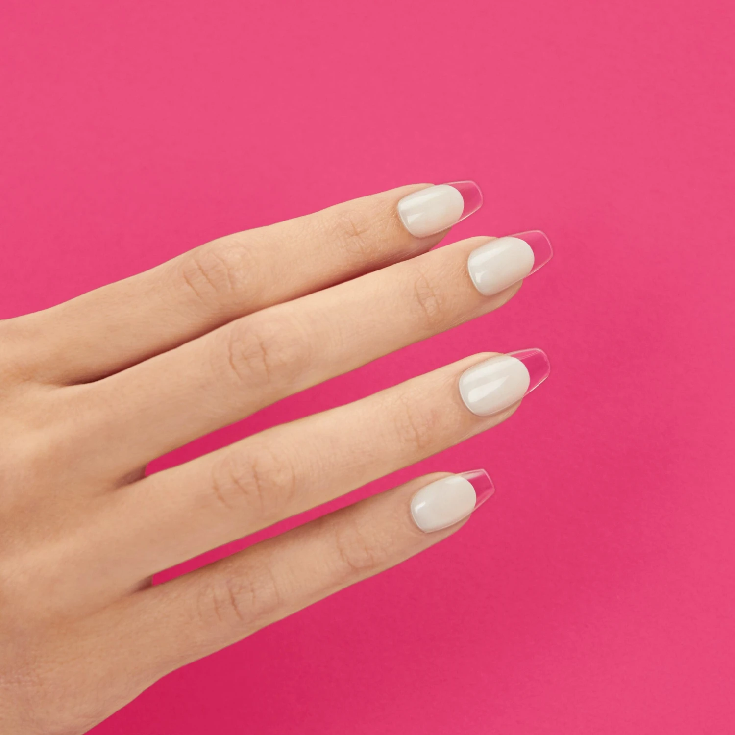 Long length, coffin shape, glossy finish press-on gel nails. Clear, retro French tips might single you out but that isn’t always a bad thing!