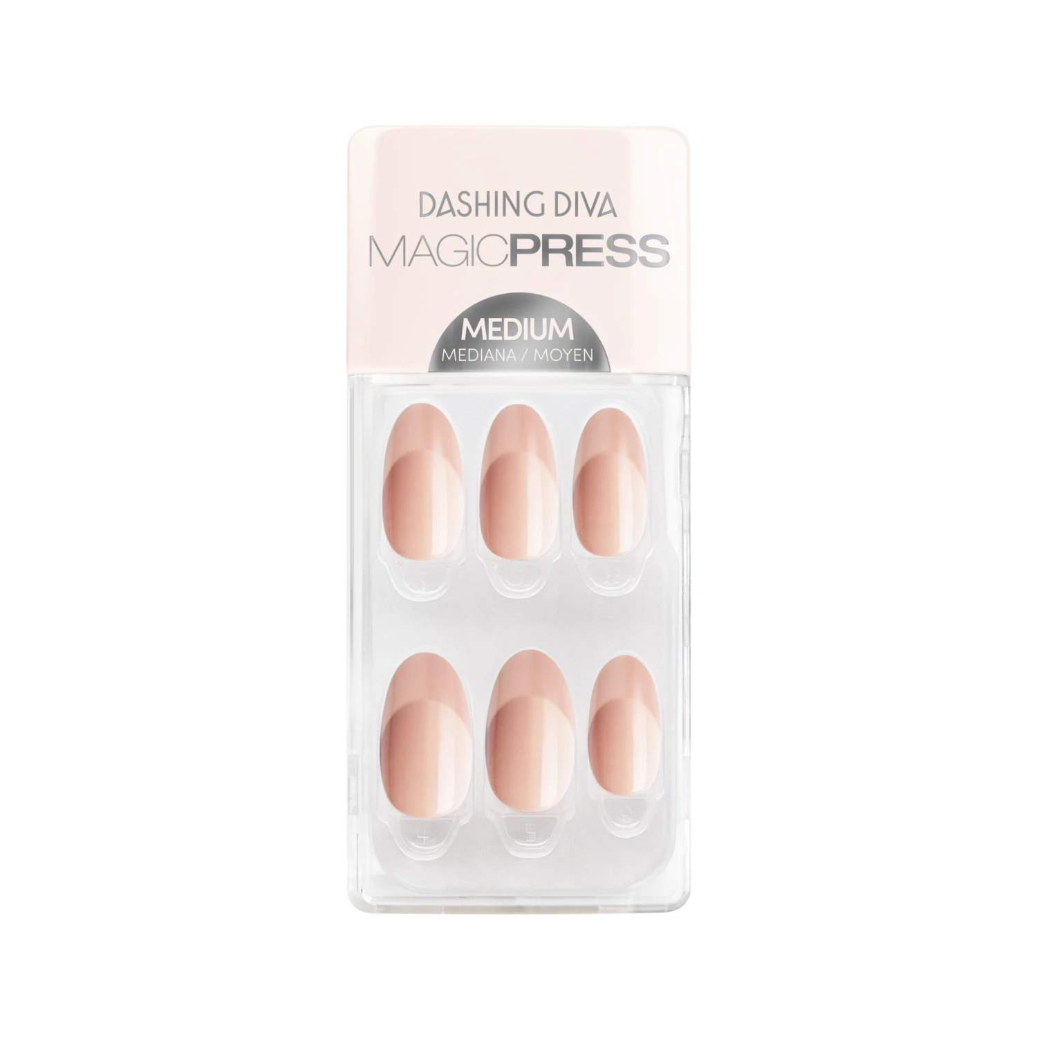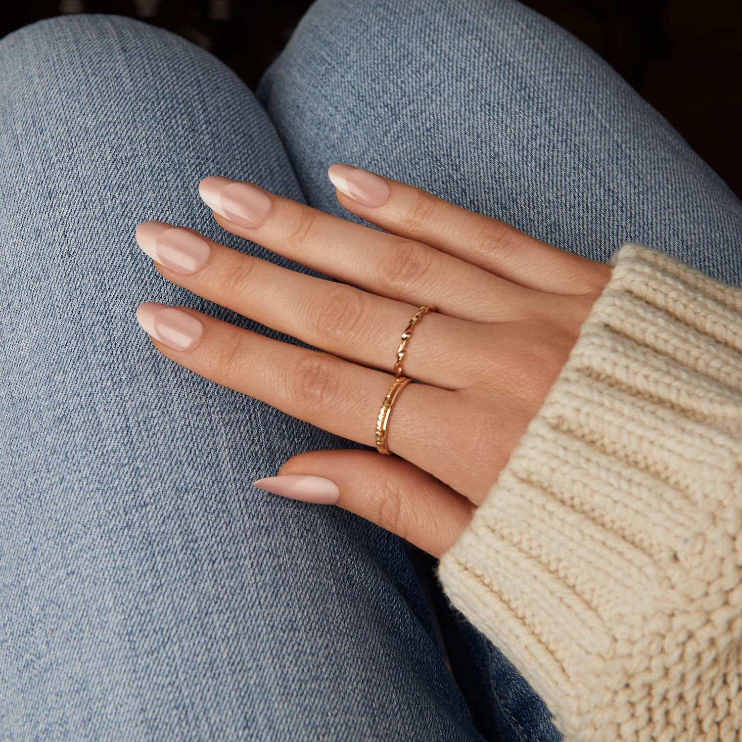 Medium length, almond shape, glossy finish. Tan & beige press-on gel nails featuring an illusion french style design.