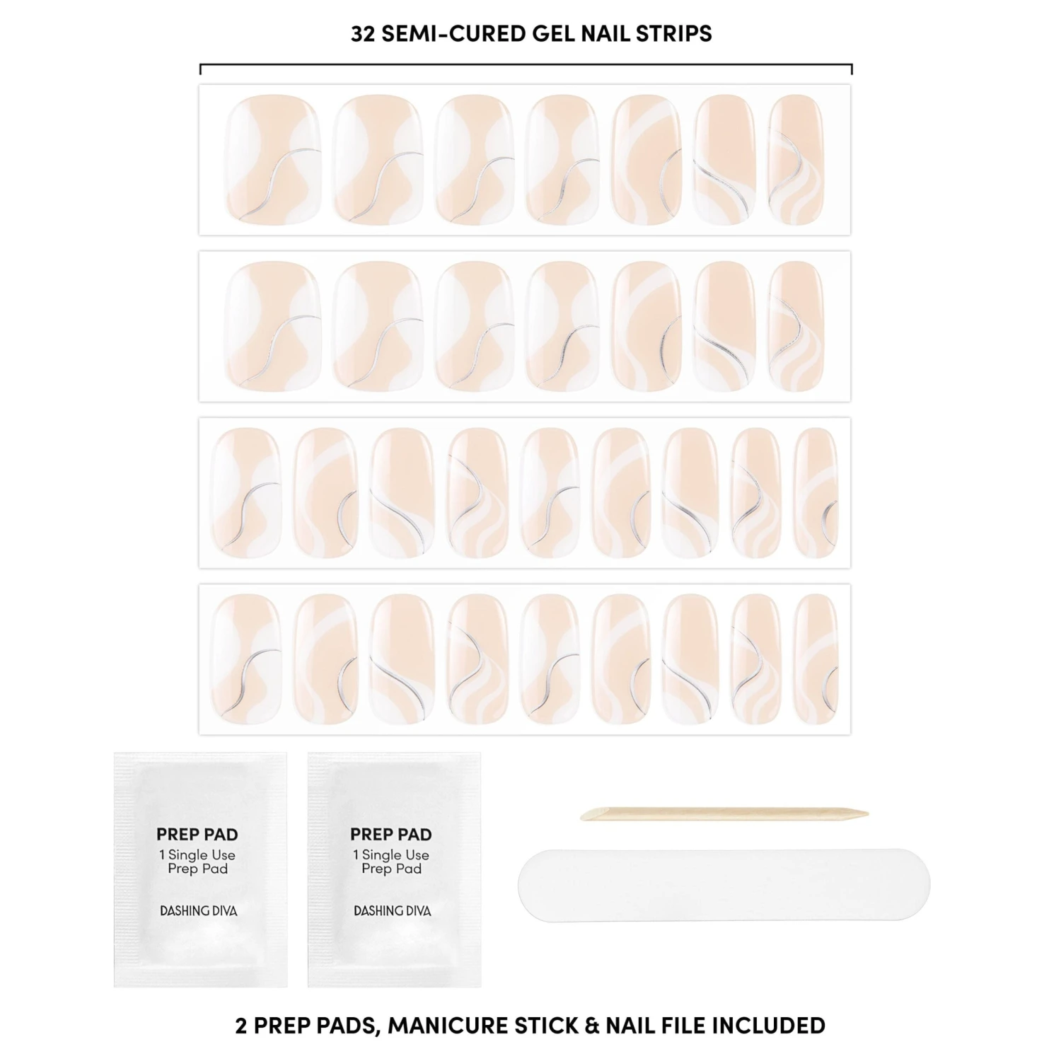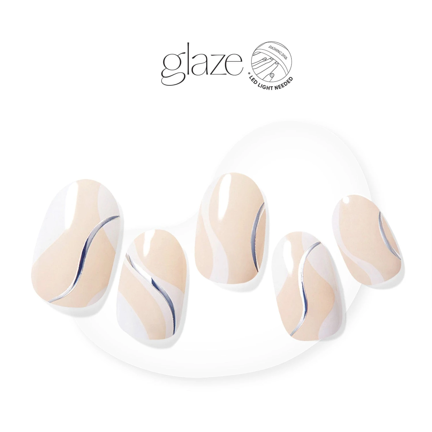 Semi-cured peachy nude gel nail strips featuring white & silver foiled abstract waves with mega volume & maximum shine.
