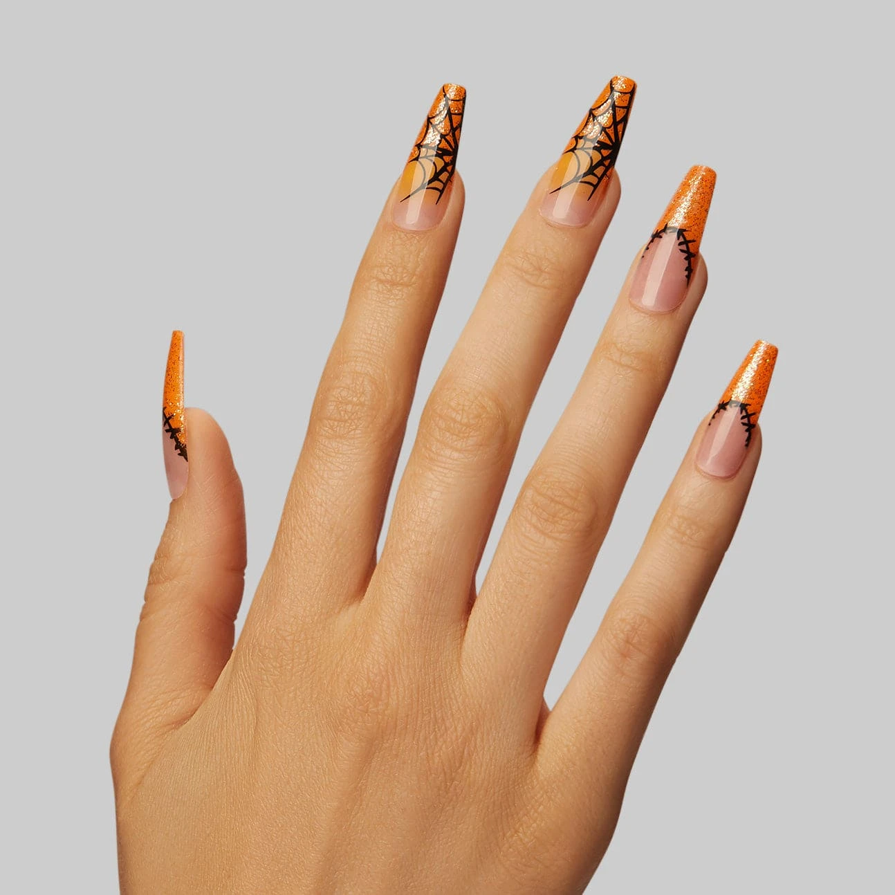 Extra long length, coffin shape, glossy finish. Sheer nude glue-on gel nails featuring bright orange french tips with stitching details, iridescent glitter, and spiderweb accents.