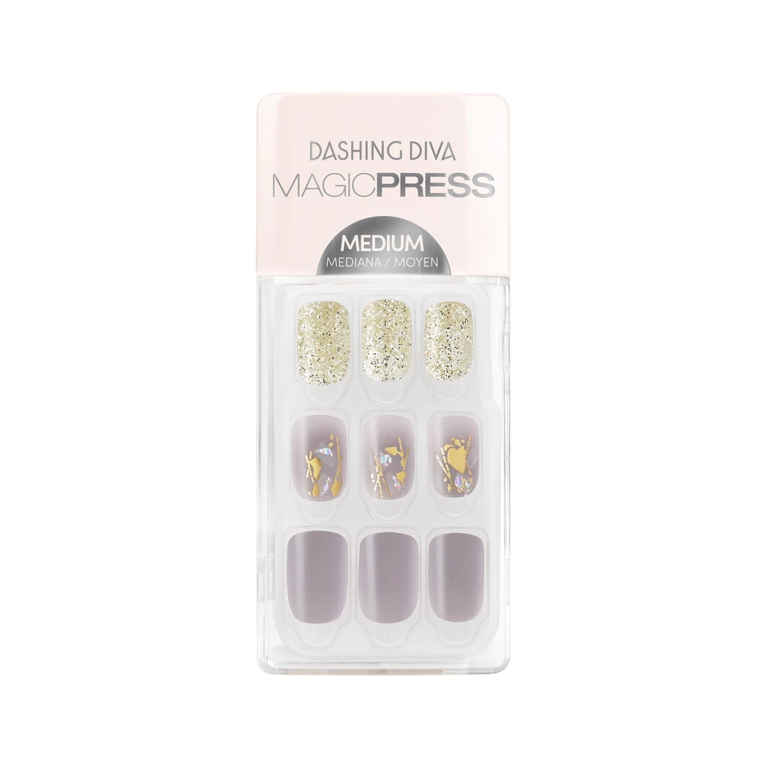 Nails that get you going from 0 gravity to 100 glam real quick. Medium length, square shape, glossy finish smoky purple press-on gel nails featuring silver glitter, gold details, and mosaic opal accents.